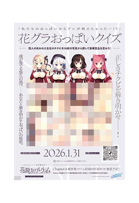 対象店舗にて、正しきチクビを解き明かせ!『花グラおっぱいクイズ』を開催します。四人の失われた左右のチクビを16枚の写真から探して豪華景品を貰おう!