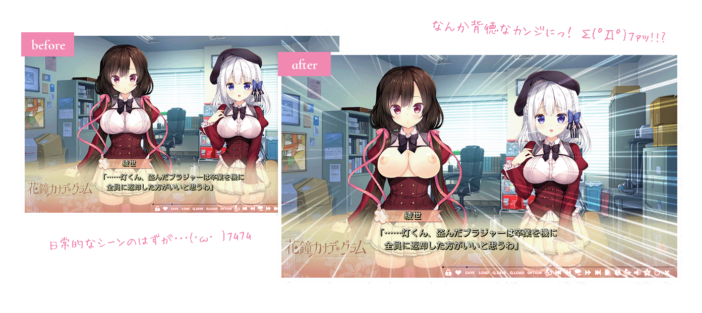 これで学園や公道、駅前モール他どこでも、ゲーム内立ち絵がシュールにおっぱいを露出しちゃいます!
